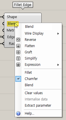 Fillet Edge component의 Blend를 RMB클릭하면 Fillet, Chamfer, Blend를 설정할 수 있다.